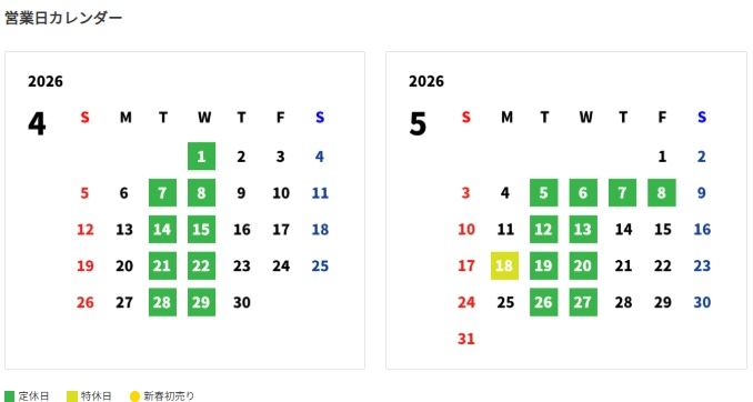 今回の更新では、2026年4月以降の店舗定休日が「火曜日・水曜日」になることを反映しています。