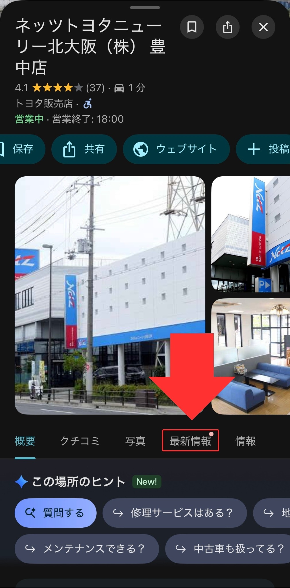 Googleマップで店舗を検索していただき、画面下のほうに「最新情報」をタップすると、その店舗のいまの情報を見ることができます。