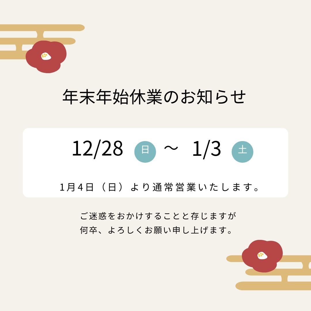 誠に勝手ながら、当社は12月28日(日)~1月3日(土)を年末年始休業とさせていただきます。