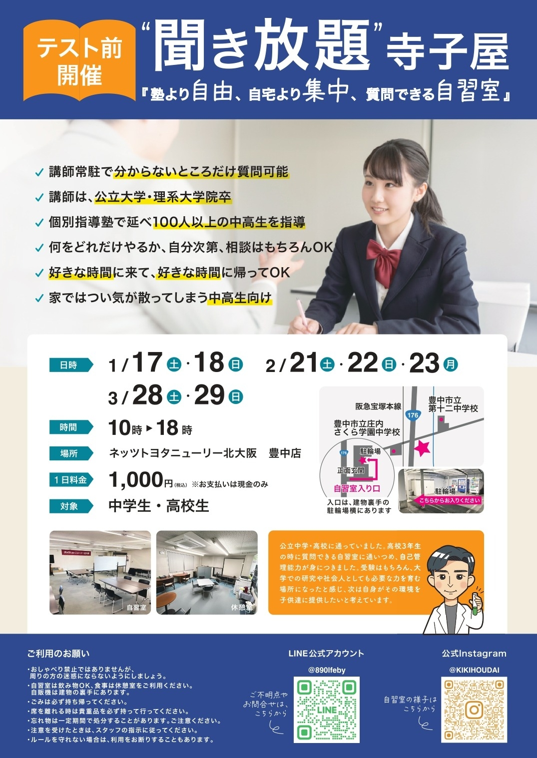 『塾より自由、自宅より集中、質問できる自習室』