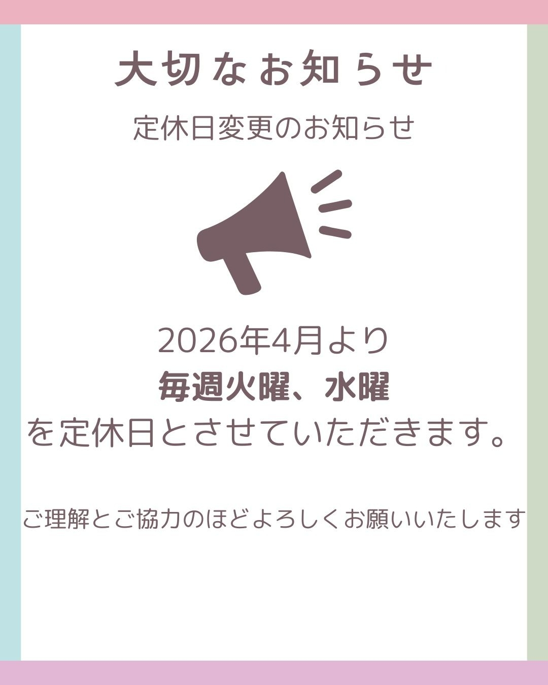 2026年4月1日より、定休日が変更となります。